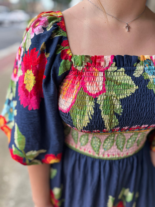 Giant Floral Border Maxi Dress with Smocked Top & Bubble Sleeves