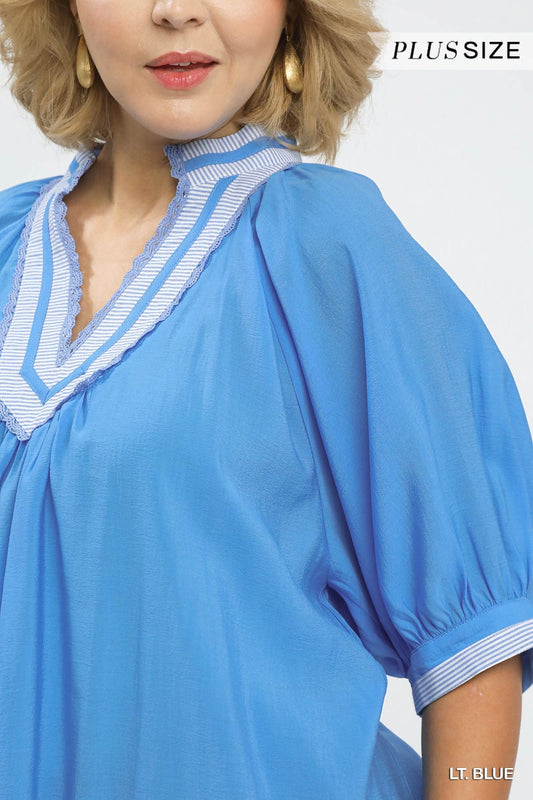 PLUS Umgee Solid Contrast Trim Pleated Top – Light Blue Mix