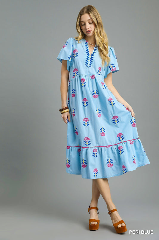 Umgee Peri Blue Embroidered Tiered Midi Dress