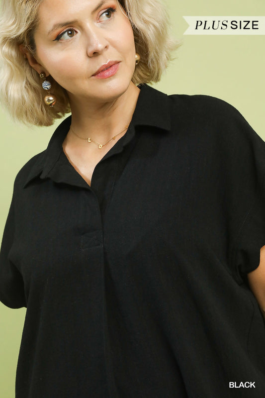 PLUS Umgee Linen Frayed Hem Scallop Edge Top – Black