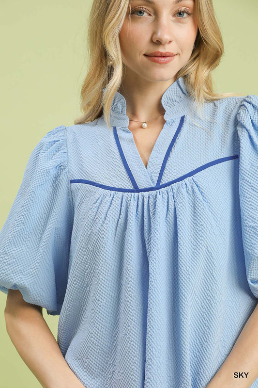 Umgee Periwinkle Contrast Scallop Trim Top with Ruffle Sleeves