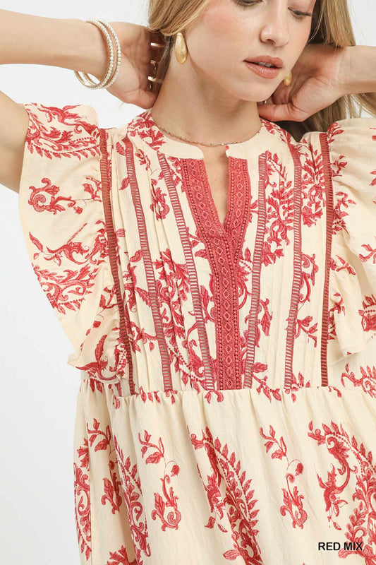 Umgee Red Mix Paisley Print Tiered Midi Dress
