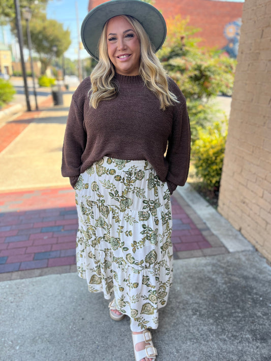 Entro Floral Print Tiered Pull-On Midi Skirt - Green