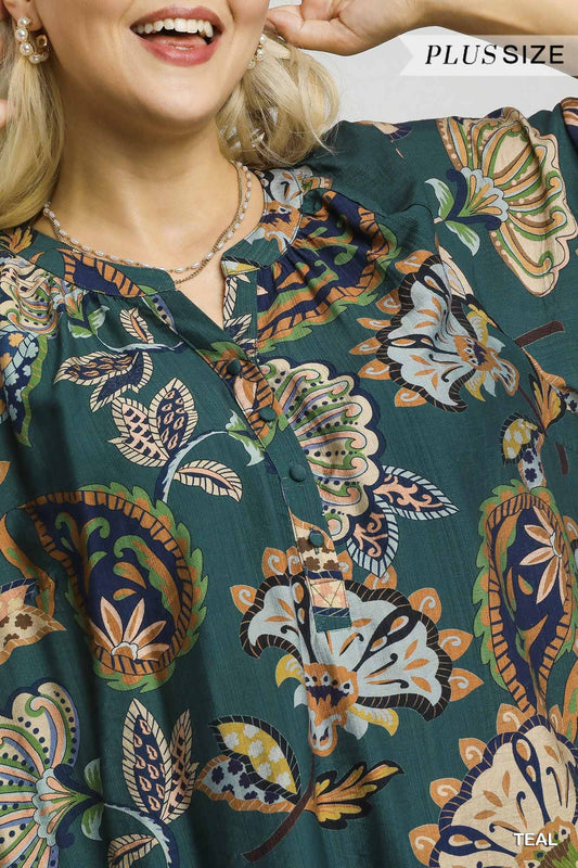 PLUS Umgee Boho Paisley Blouse with Puff Sleeves – Teal