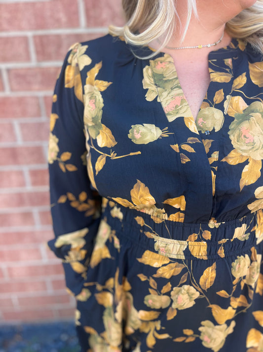 PLUS Umgee Floral Print Tiered Midi Dress with Gold-Button Detail – Black Mix