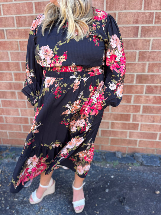 PLUS Umgee Boho Floral Tiered Midi Dress with Puff Sleeves – Black Mix