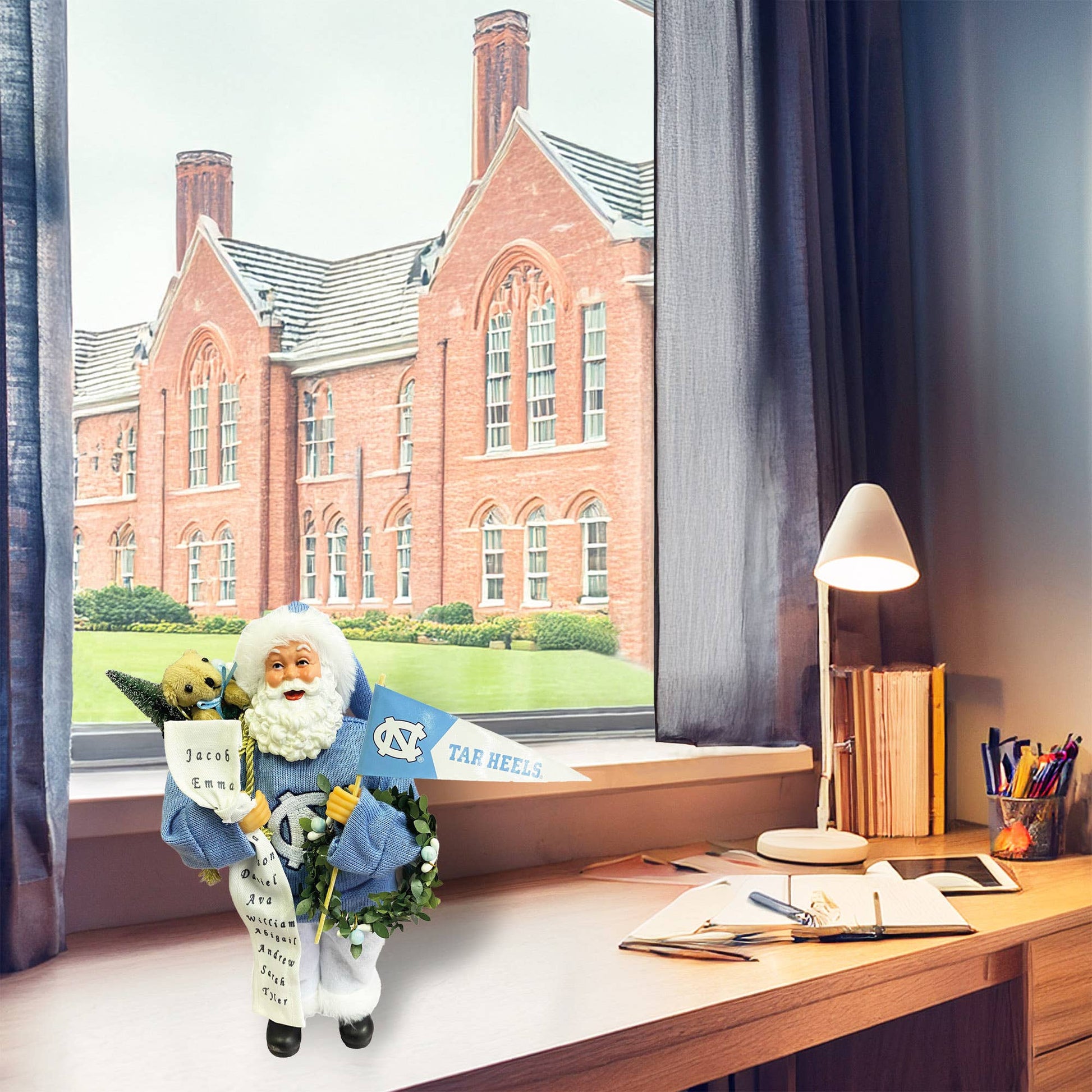 Has your team been good this year? Really good? Well, even if your favorite team didn't take the championship, Santa will make sure you have a perfect season! Wearing his favorite logoed sweater and toting a Christmas list, wreath, school pennant and big sack of goodies, Santa is ready to round up his reindeer and head to your town. Make the holiday season one to remember with this wonderfully handcrafted 12" UNC Proud Santa.