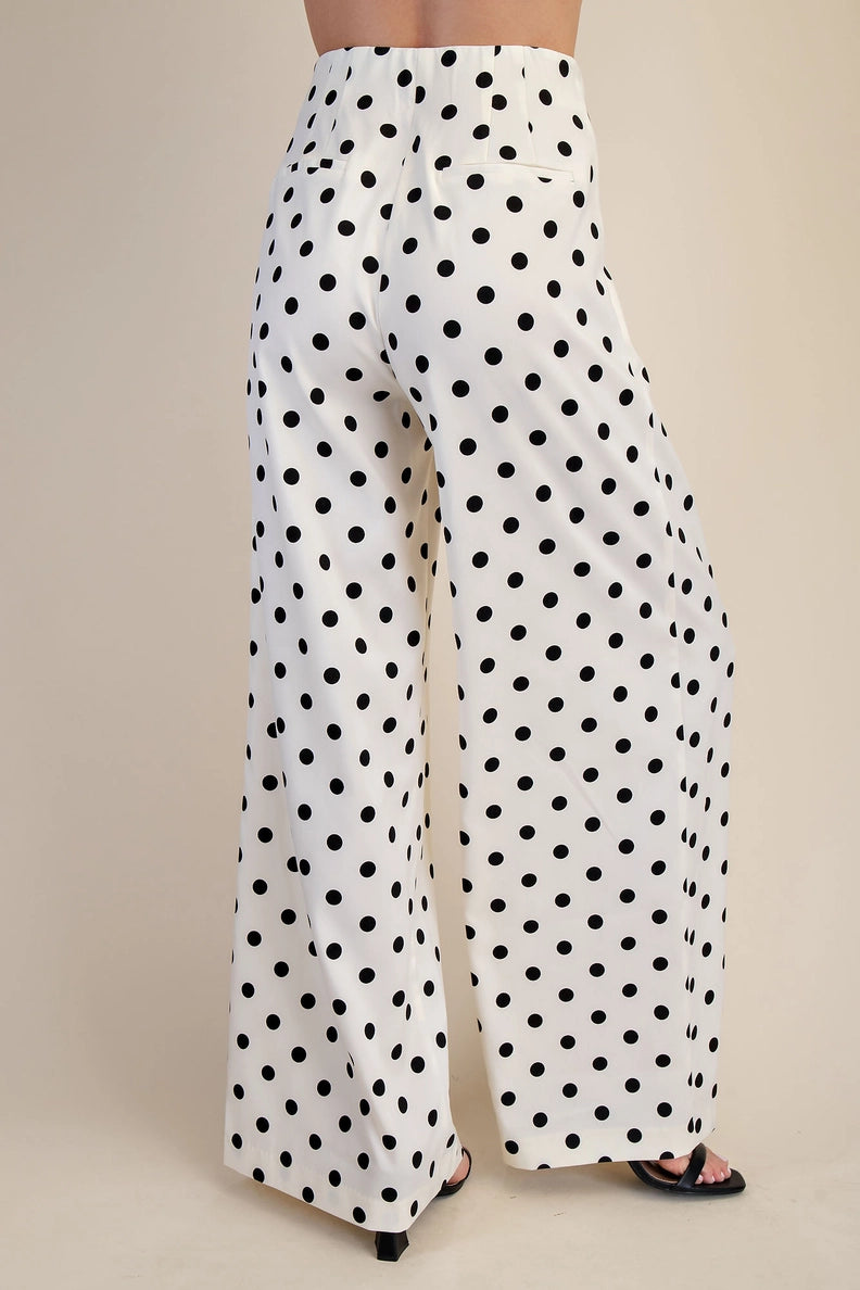 Glam Pleated High-Waisted Wide Leg Polka Dot Pants – Cream & Black