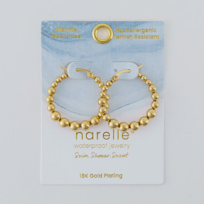 Chic and understated, the Narelle Waterproof Bubble Hoop Earrings offer a trendy bubble hoop design in the classic, goes-with-everything silver. With a familiar pin catch closure and effortless style, these earrings will easily become a wardrobe staple. Waterproof , stainless steel plated and made with a specialized PVD technique to withstand the rigors