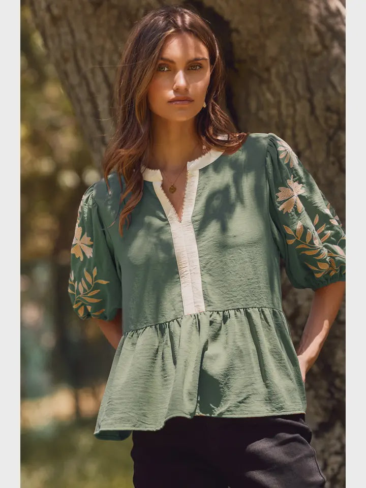Oddi Puff Sleeve Peplum Blouse [Basil Green] – Fall & Winter Chic Tops for Women