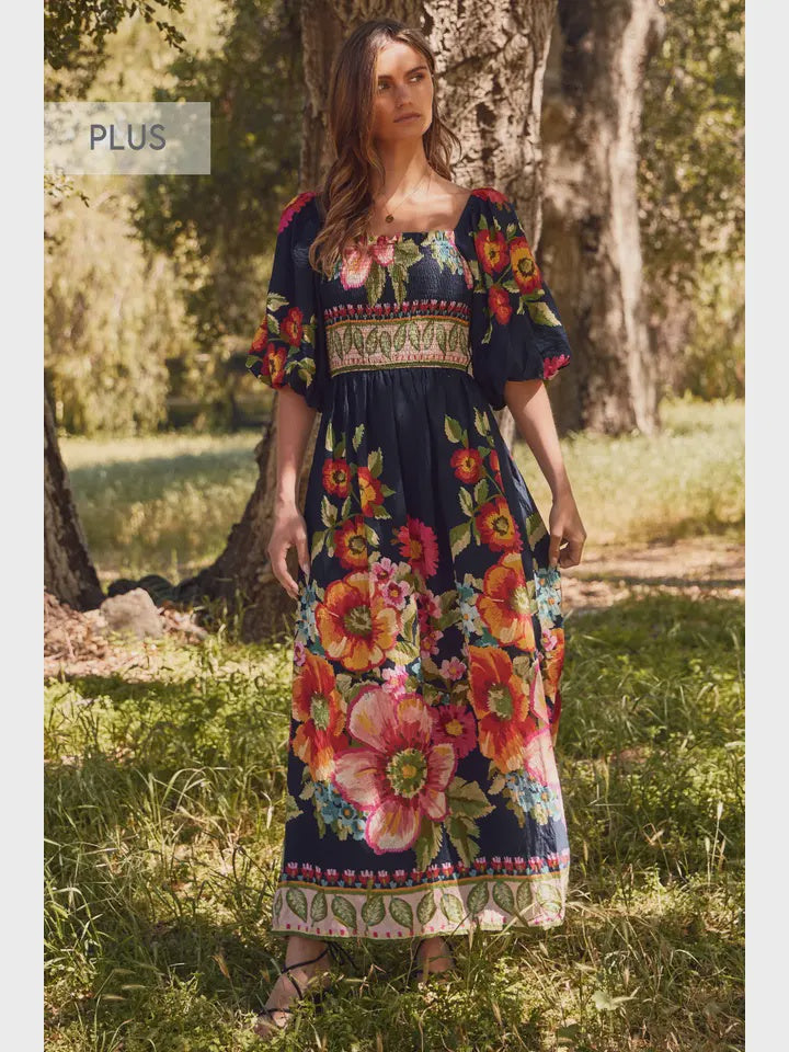 Make a bold and beautiful entrance in this Giant Floral Border Printed Maxi Dress, featuring dramatic bubble sleeves and a flattering smocked bodice. Designed with an eye-catching floral border print, this flowing silhouette is perfect for garden parties, weddings, vacations, or everyday elegance.