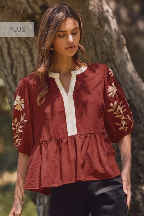PLUS Oddi Puff Sleeve Peplum Blouse [Burgundy] – Fall & Winter Tops