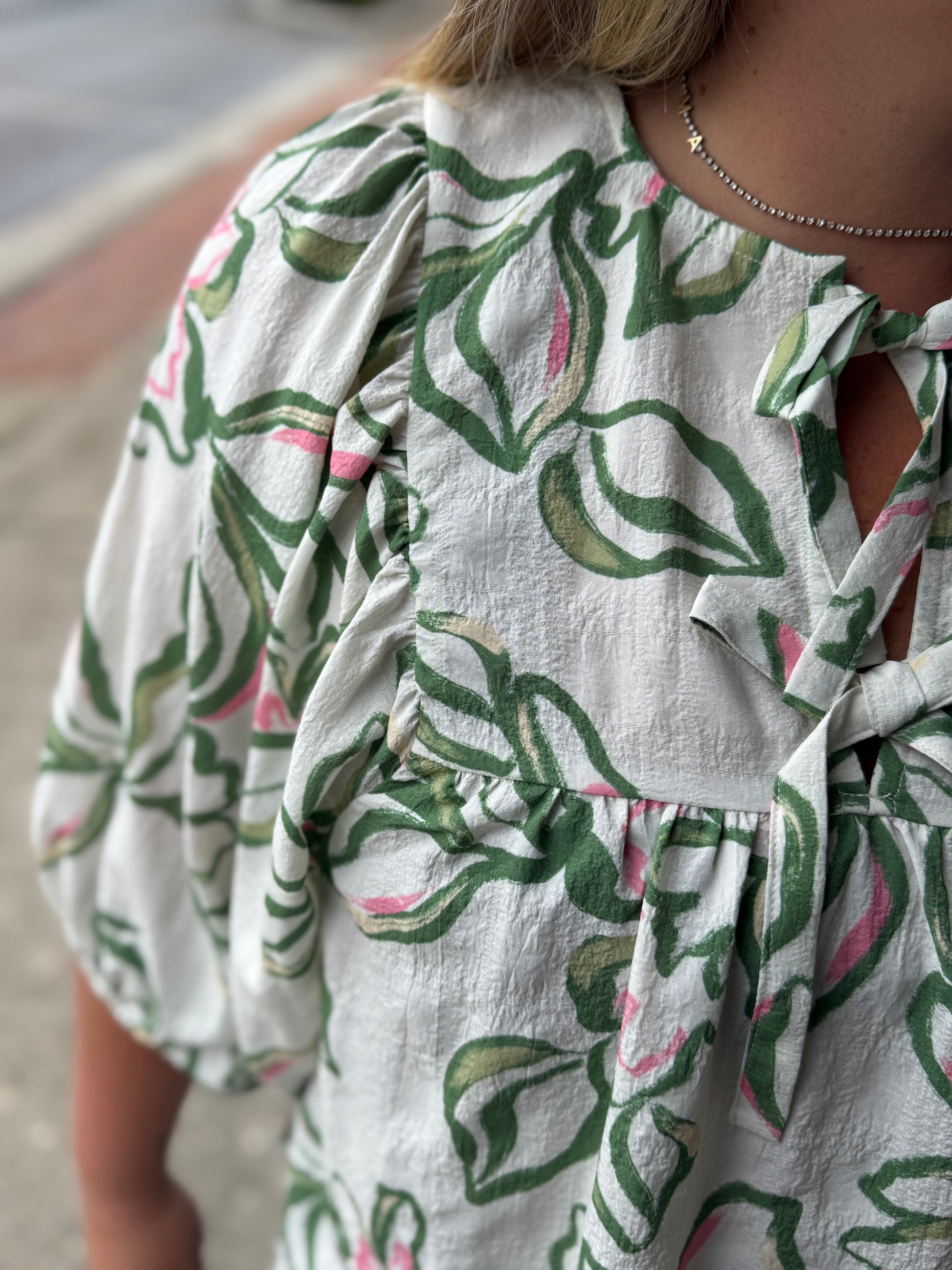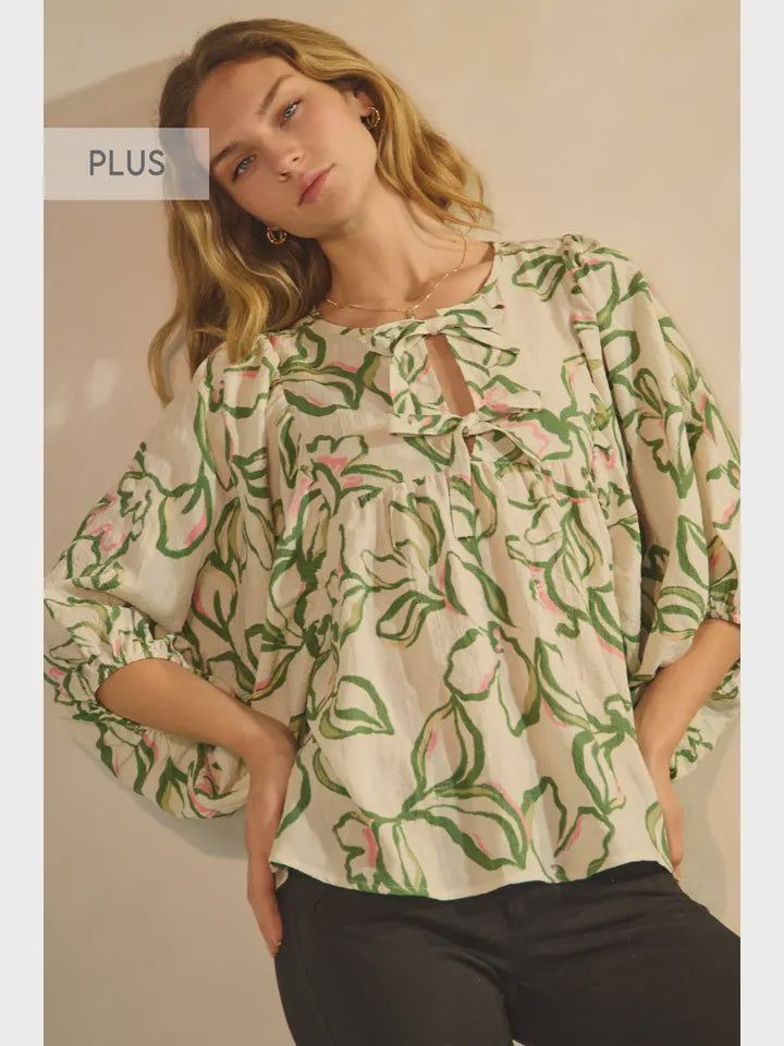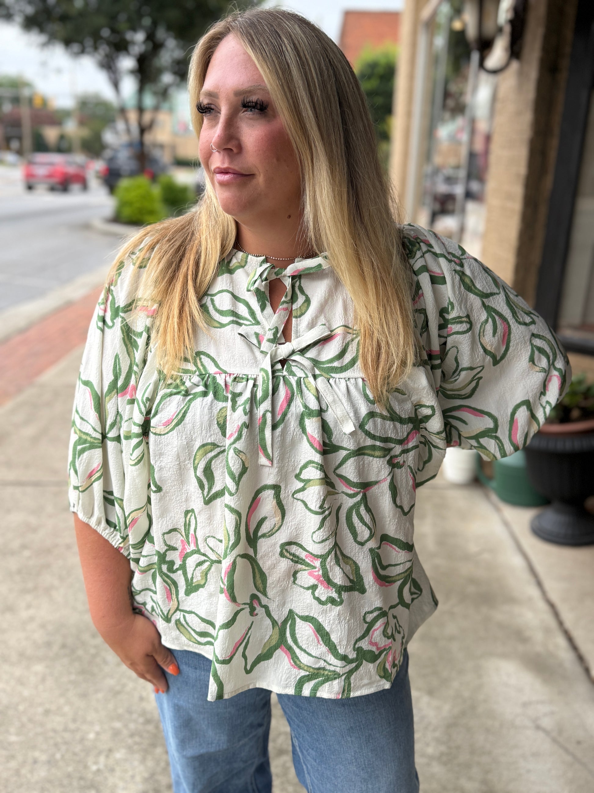 PLUS Textured Floral Blouse with Front Tie- Pink/Green Print