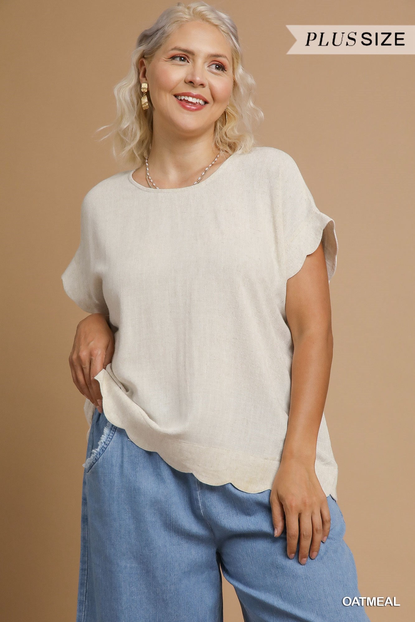 Effortlessly chic and breathable, the PLUS Umgee Scallop Hem Linen Blend Top is your new warm-weather go-to. Crafted from a breezy linen-cotton blend, this top features delicate scalloped edges on the sleeves and hem for a feminine touch.