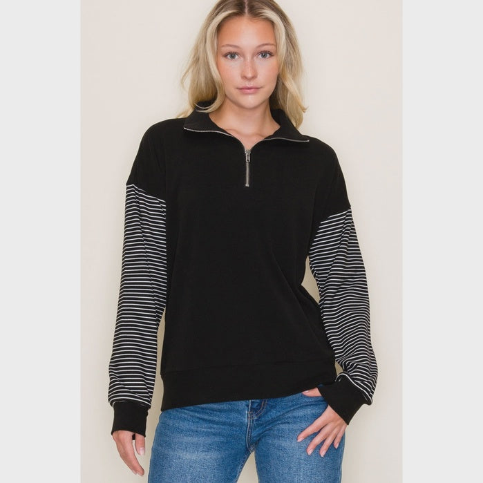 Elevate your casual wardrobe with the Staccato Black & White Half Zip Color Block Brushed Top—a piece that blends sporty details with everyday chic. Featuring a cozy mock neckline, easy half-zip front, and ultra-soft brushed knit, this sweatshirt-style pullover offers both comfort and style. The solid black body keeps it sleek, while the black-and-white striped sleeves add a modern twist you’ll love for fall.