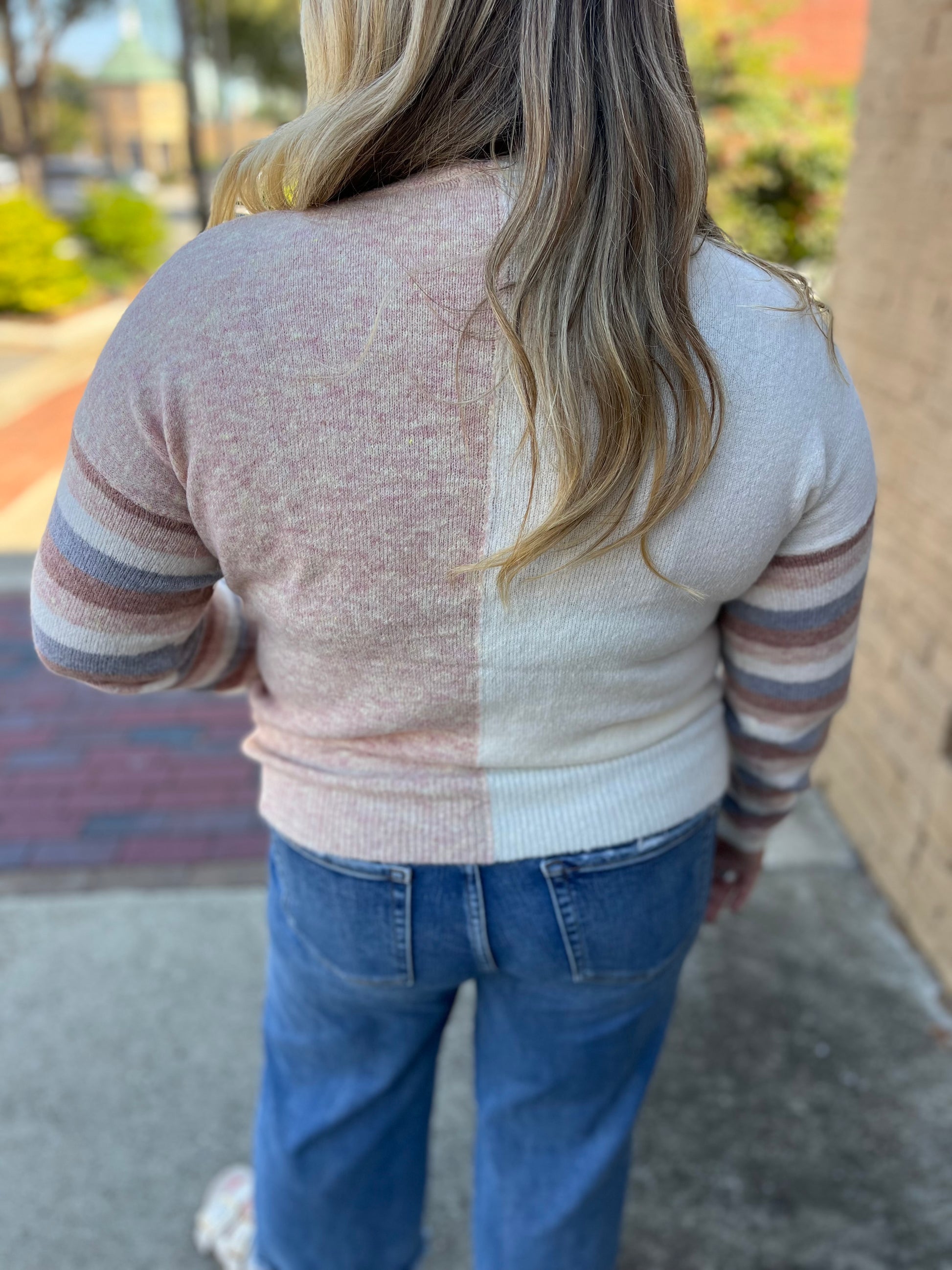 Cozy meets chic in the Staccato Blush Color Block Stripe V-Neck Sweater. This super-soft knit features a flattering V-neckline, long sleeves, and a playful mix of blush tones with multicolor stripes for the perfect pop of personality. Lightweight yet warm, it’s the kind of sweater you’ll reach for again and again when you want comfort without sacrificing style.