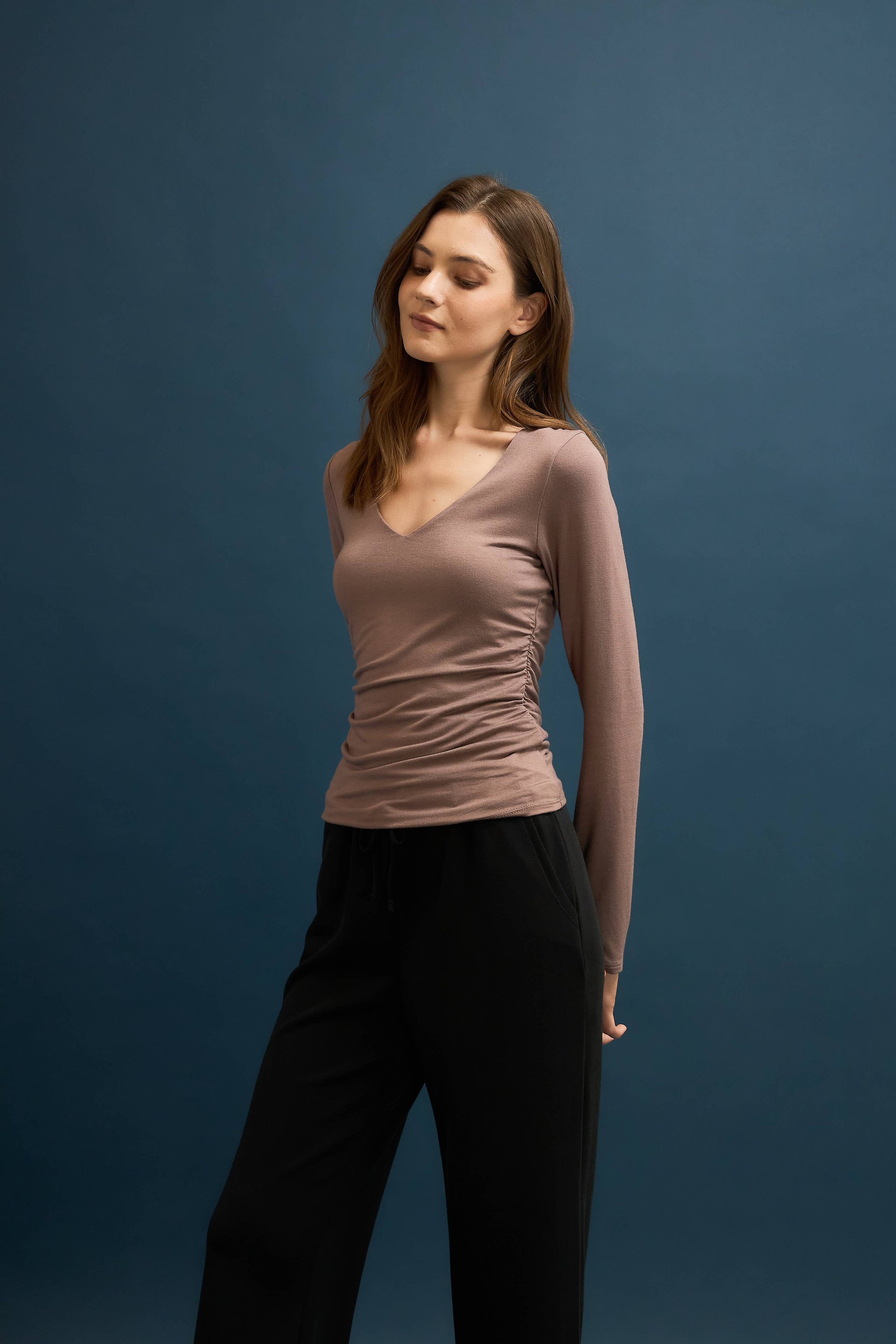 The flattering V-neckline creates a feminine silhouette while the side ruching detail adds subtle texture and contouring that accentuates the waist beautifully. Crafted from a luxurious 95% rayon / 5% spandex fabric blend, this top is incredibly soft, stretchy, and comfortable for all-day wear. The fitted design hugs the body without feeling restrictive, making it a perfect option for both casual and dressier outfits.